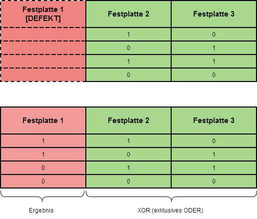 wenn ihr jetzt nach einem Ausfall noch 2 von 3 Festplatten überhabt, könnt ihr anhand der Paritäten in den restlichen 2 Platten bestimmen, was wiederhergestellt werden muss.