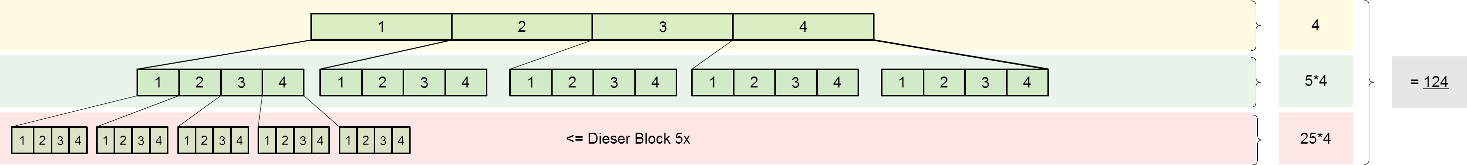 es ist einfach immer MAL 5 => denn 2*2+1 (Knoten * 2 + 1 Kind)